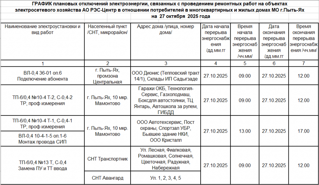 Плановые отключения на 27.10.2024 по городу Пыть-Ях