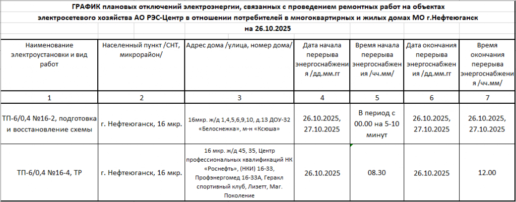 Плановые отключения на 16.10.2024 по городу Пыть-Ях
