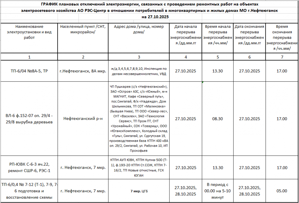 Плановые отключения на 27.10.2024 по городу Нефтеюганск