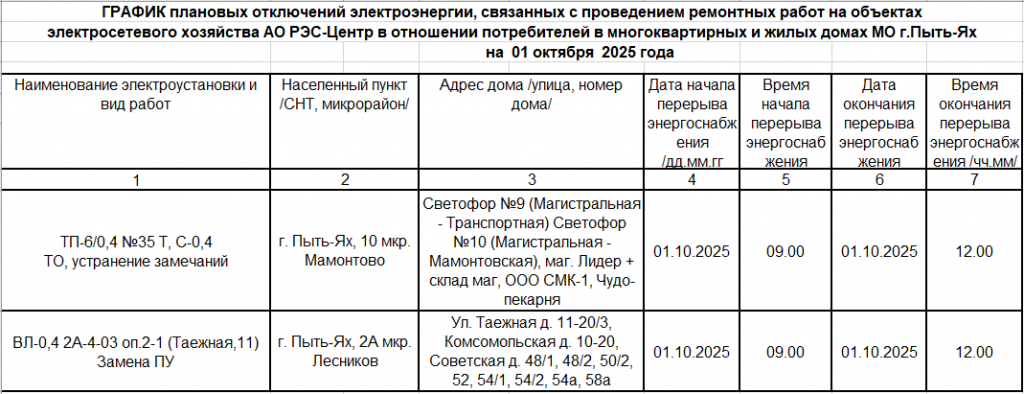Плановые отключения на 01.10.2024 по городу Пыть-Ях