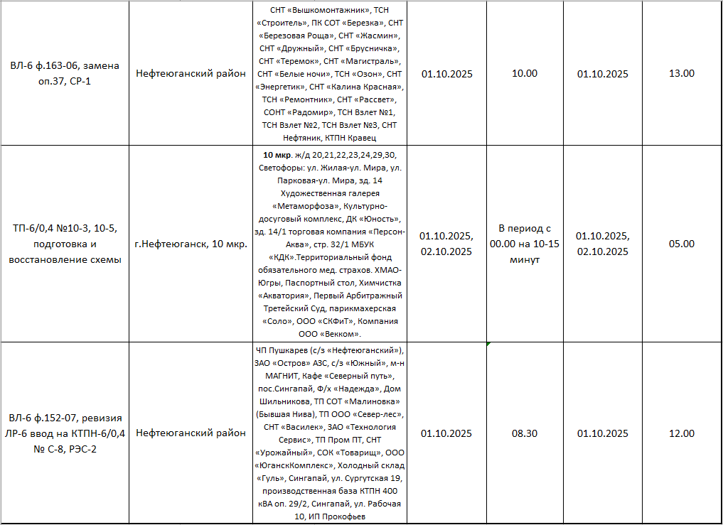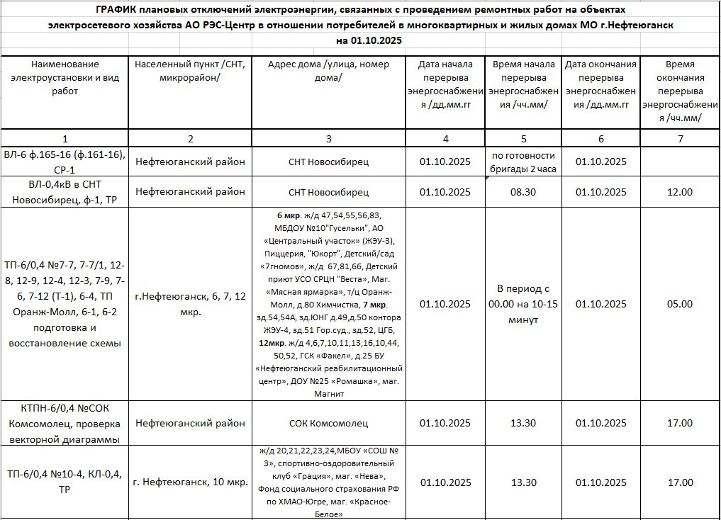 Плановые отключения на 01.10.2024 по городу Нефтеюганск