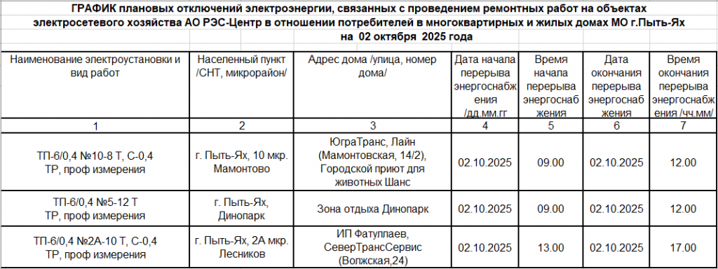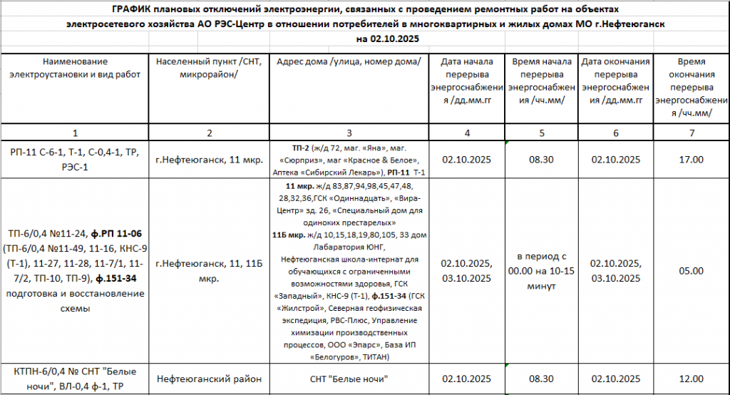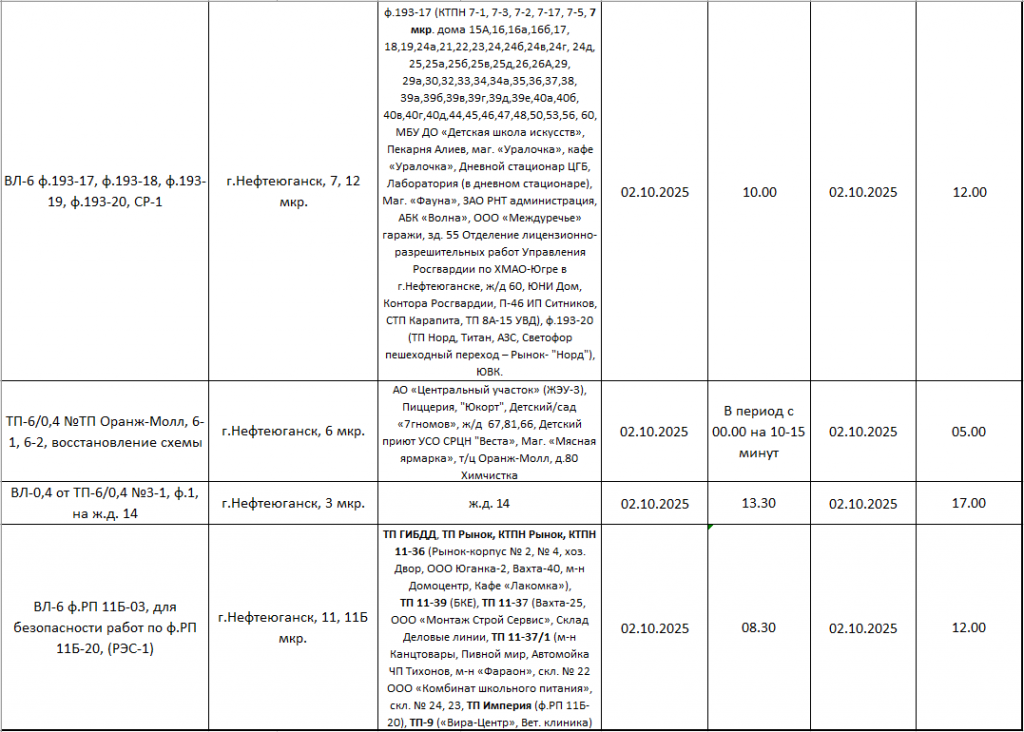 Плановые отключения на 02.10.2024 по городу Пыть-Ях
