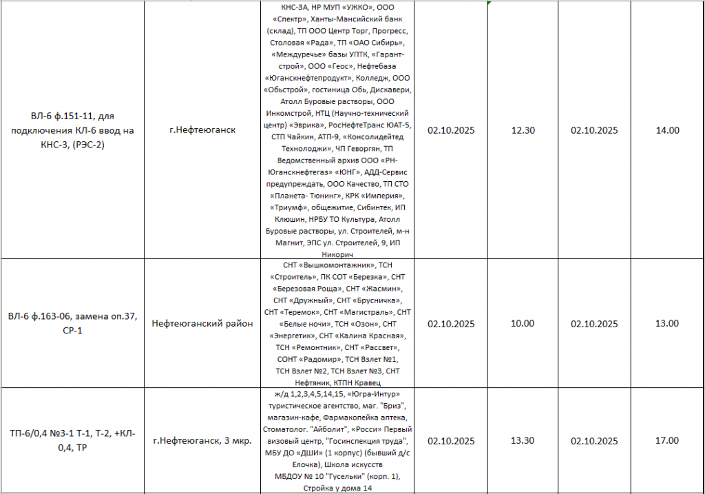 Плановые отключения на 02.10.2024 по городу Нефтеюганск