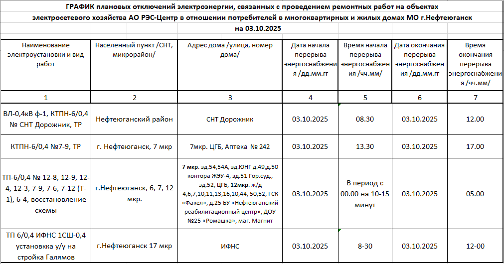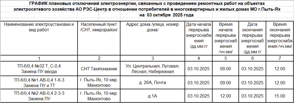 Плановые отключения на 03.10.2024 по городу Пыть-Ях