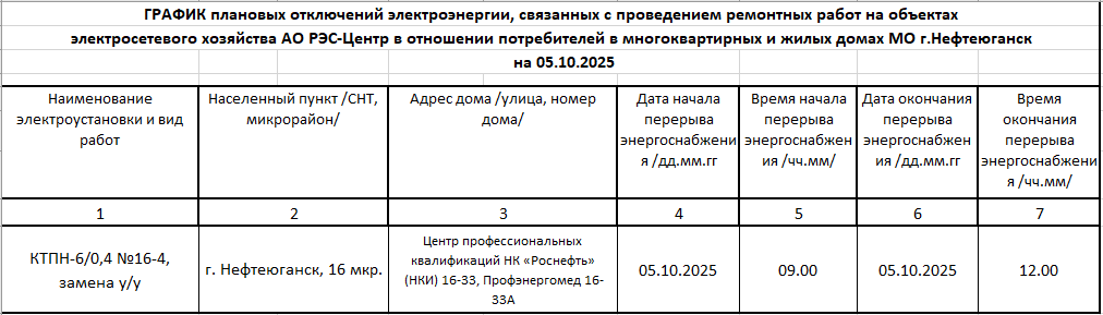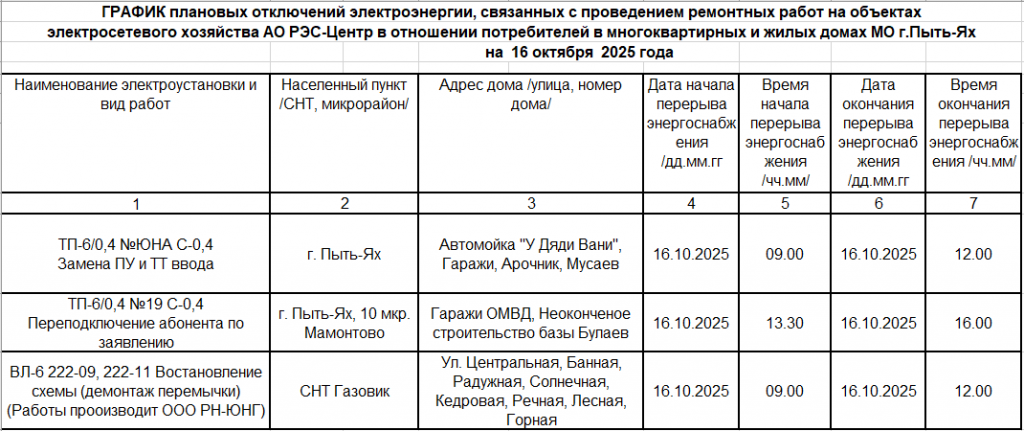 Плановые отключения на 16.10.2024 по городу Пыть-Ях