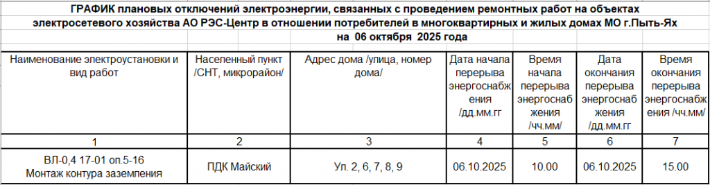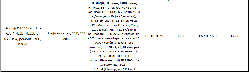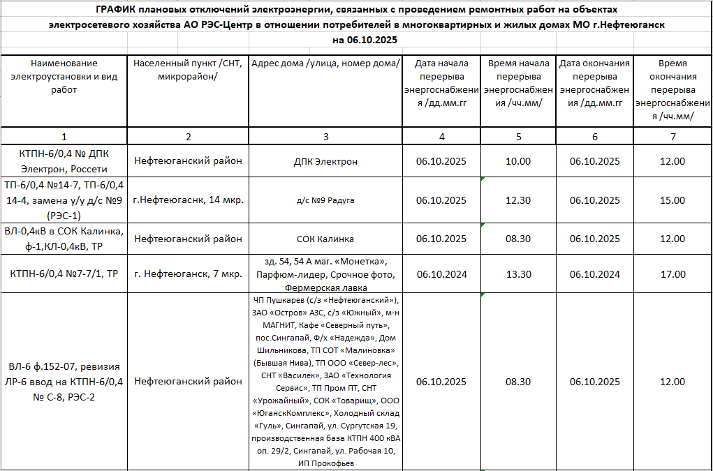 Плановые отключения на 06.10.2024 по городу Пыть-Ях