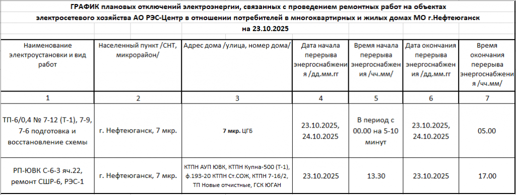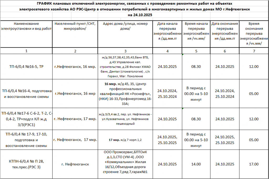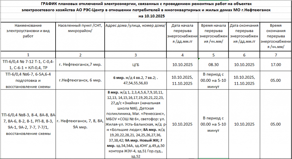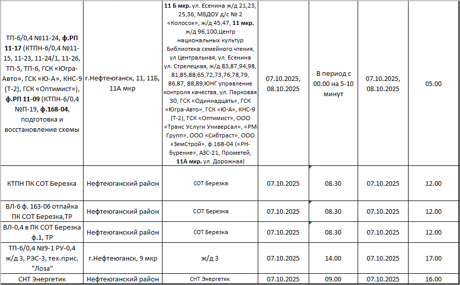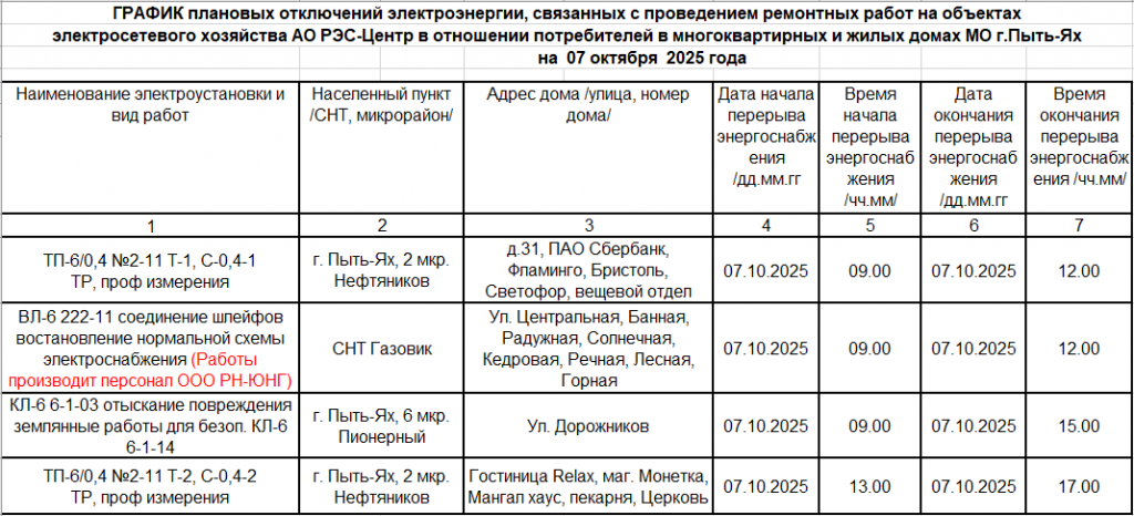 Плановые отключения на 07.10.2024 по городу Пыть-Ях