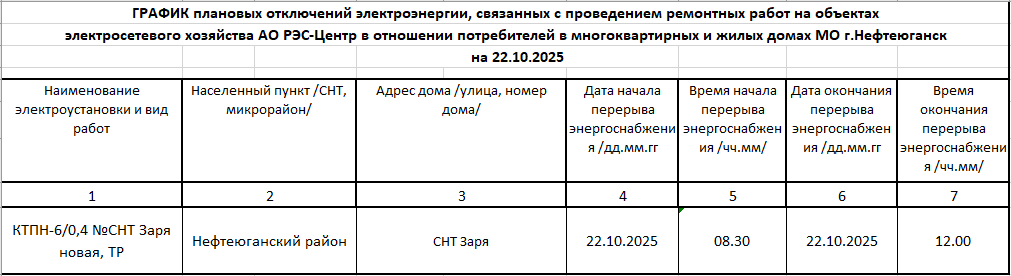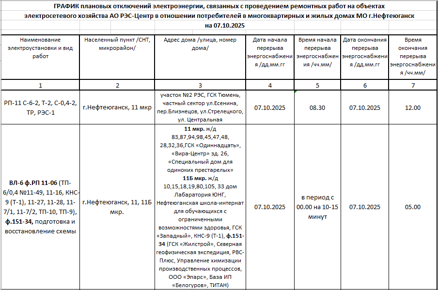 Плановые отключения на 07.10.2024 по городу Нефтеюганск