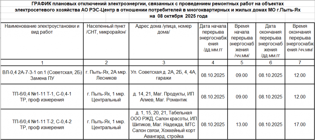Плановые отключения на 08.10.2024 по городу Пыть-Ях