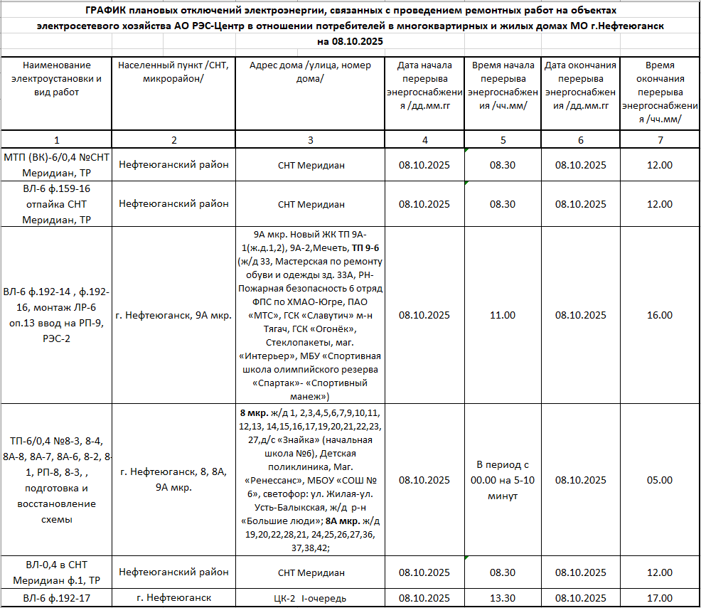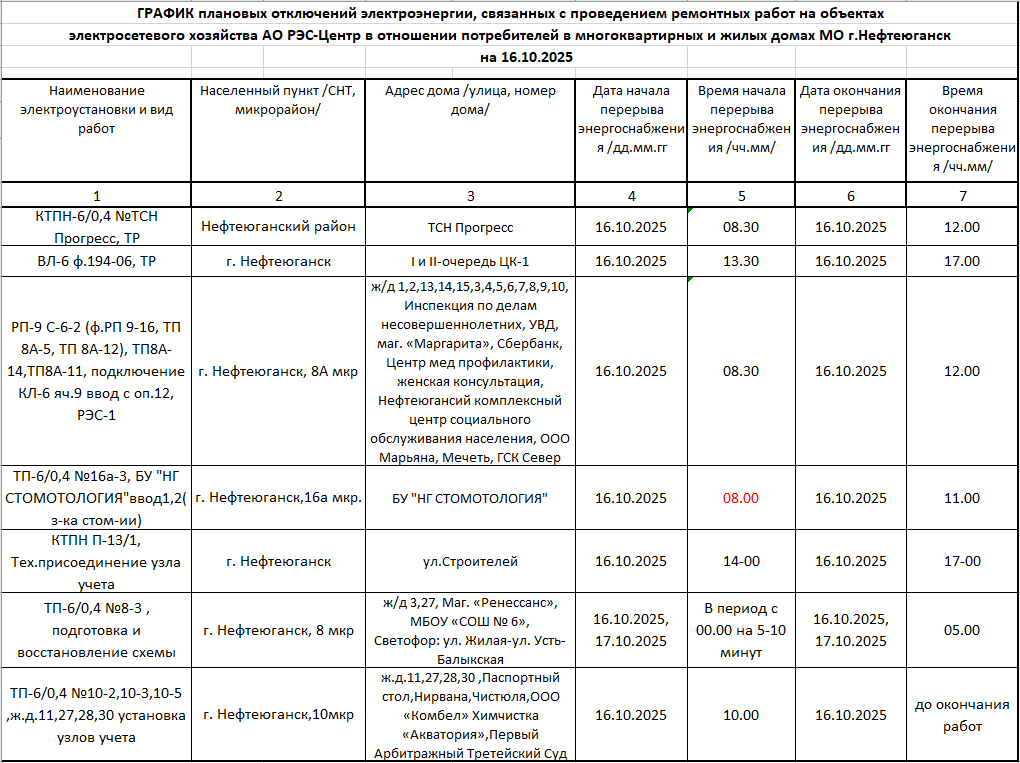 Плановые отключения на 08.10.2024 по городу Нефтеюганск
