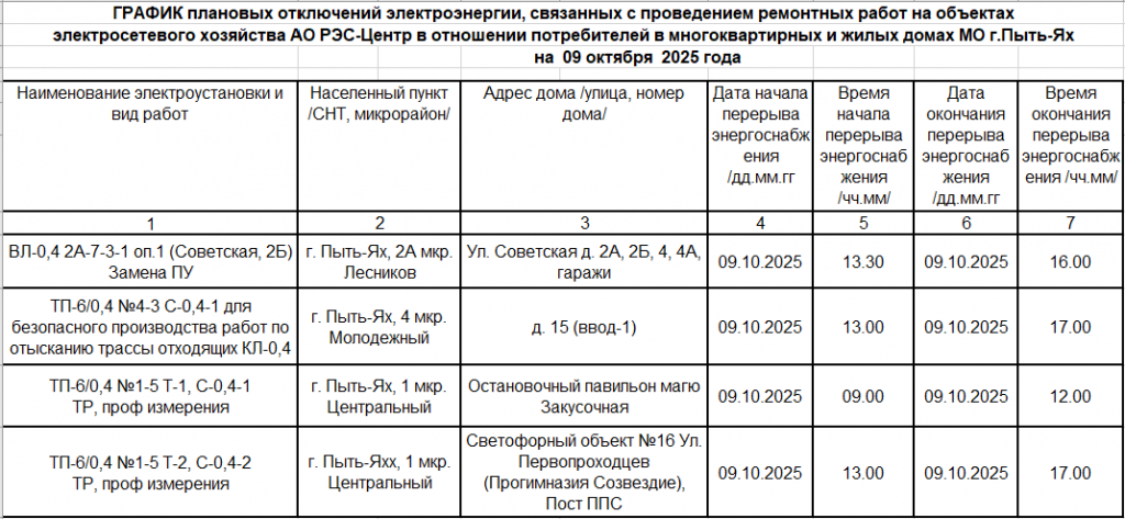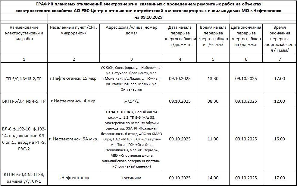 Плановые отключения на 09.10.2024 по городу Пыть-Ях
