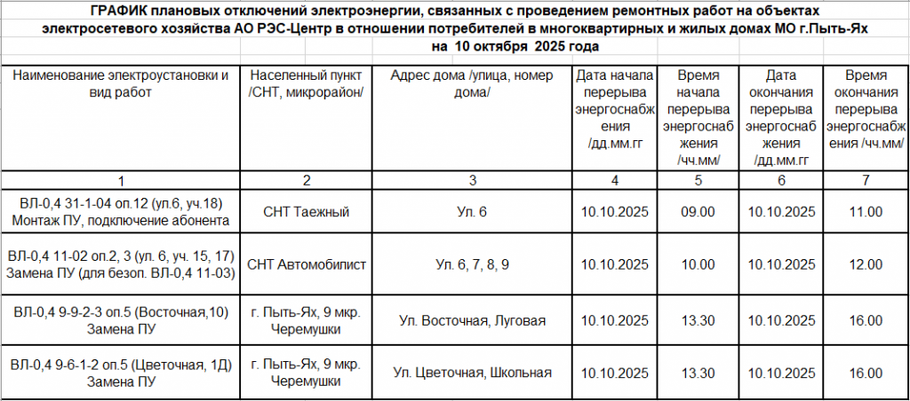 Плановые отключения на 10.10.2024 по городу Пыть-Ях