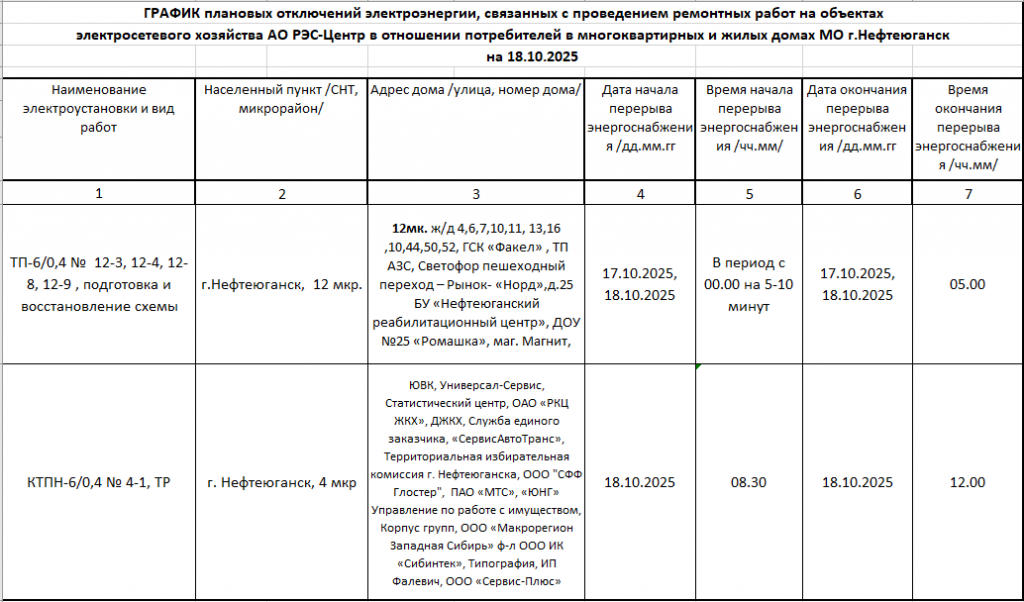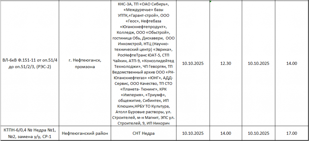 Сводный график отключений на Октябрь по городу Пыть-Ях