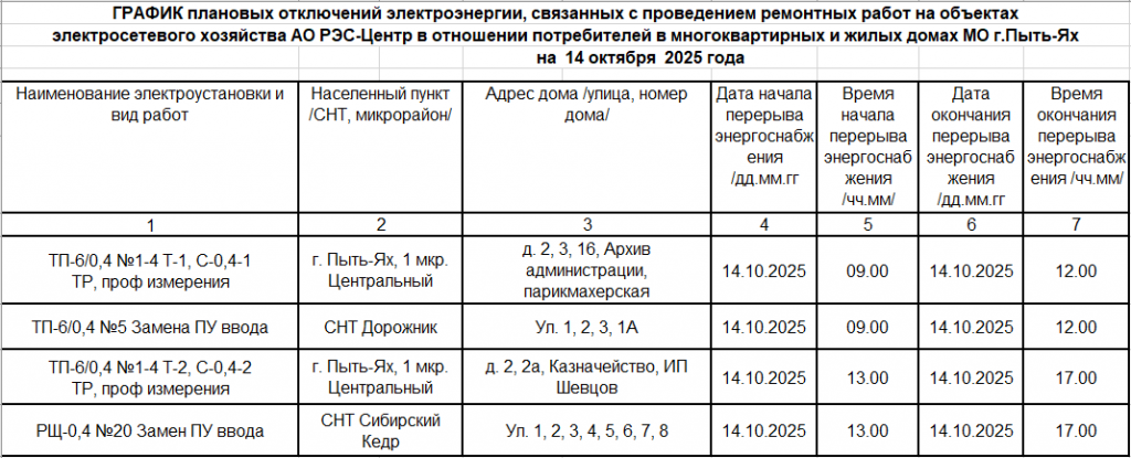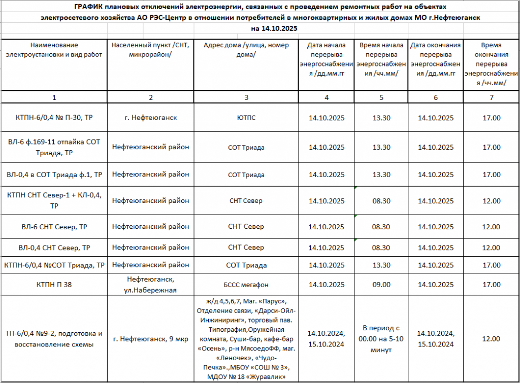 Плановые отключения на 14.10.2024 по городу Пыть-Ях