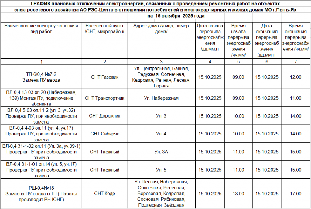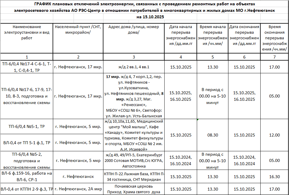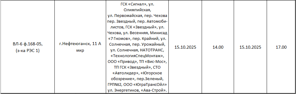 Плановые отключения на 15.10.2024 по городу Пыть-Ях