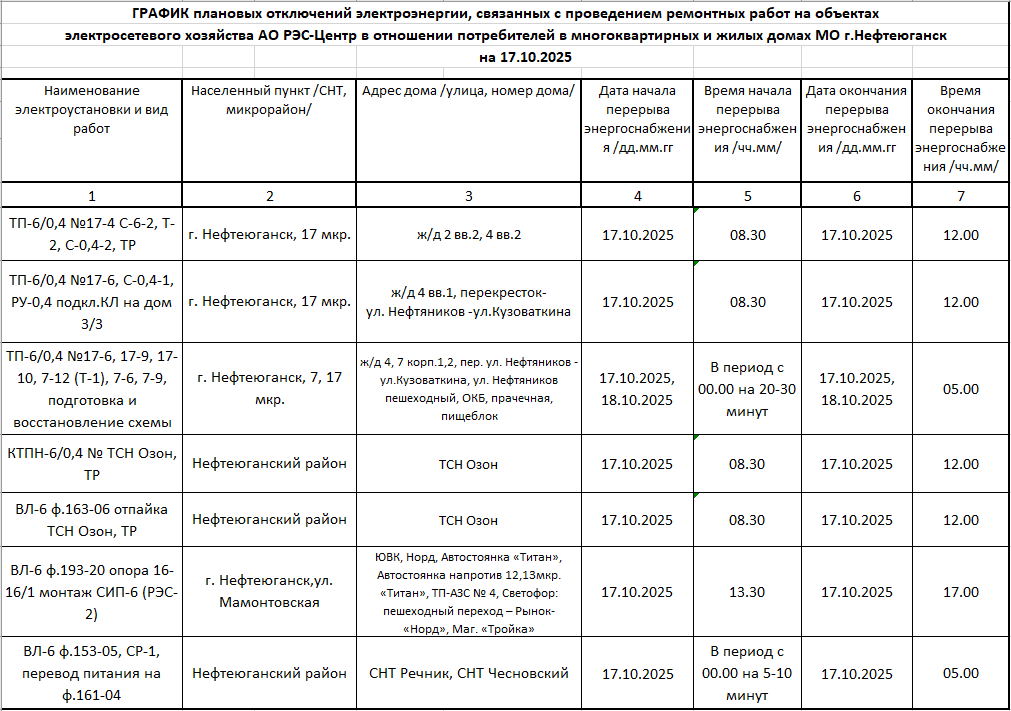 Плановые отключения на 17.10.2024 по городу Нефтеюганск