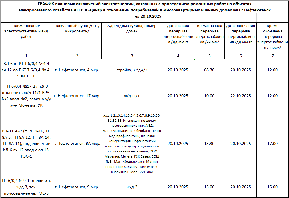 Плановые отключения на 20.10.2024 по городу Нефтеюганск