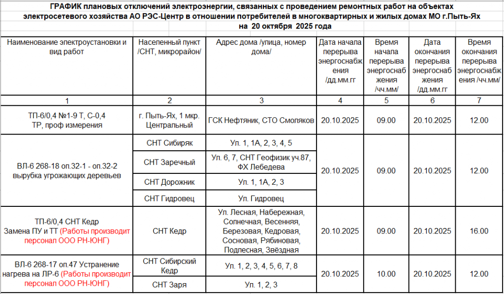 Плановые отключения на 20.10.2024 по городу Пыть-Ях