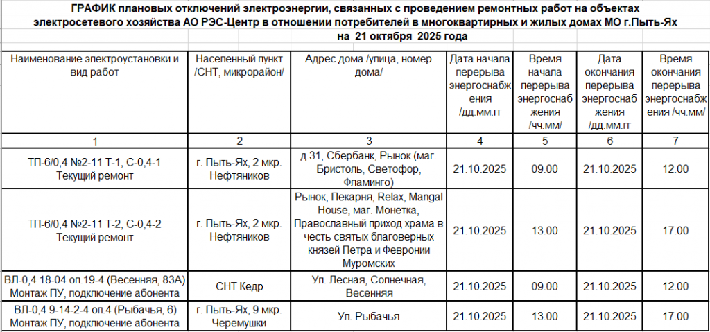 Плановые отключения на 21.10.2024 по городу Пыть-Ях