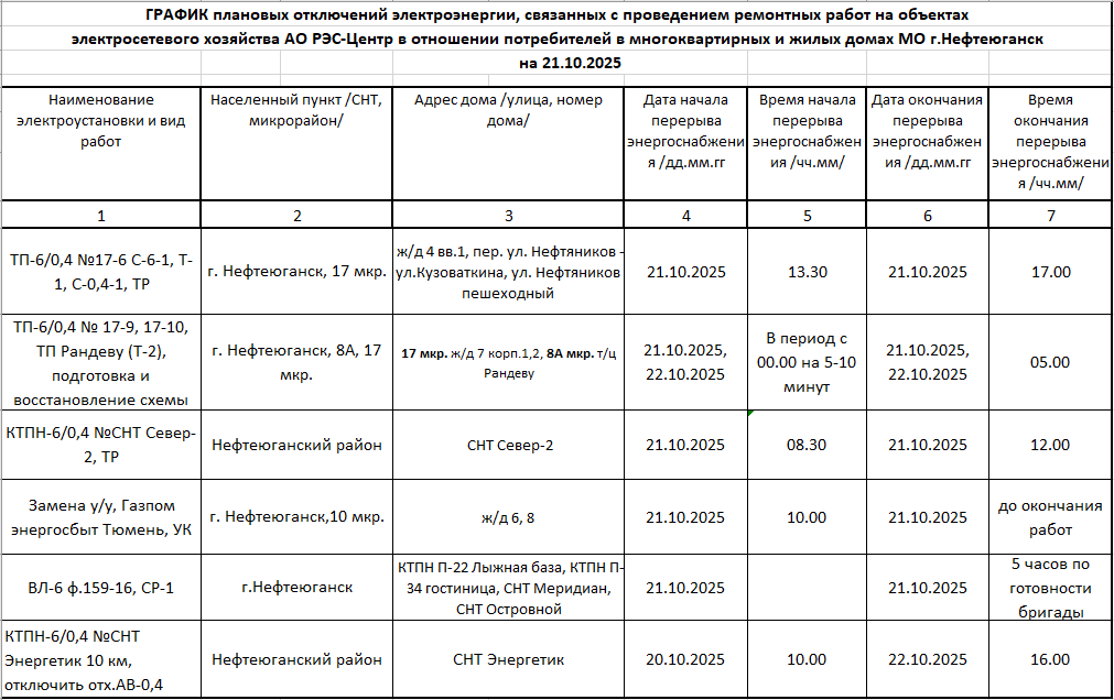 Плановые отключения на 21.10.2024 по городу Нефтеюганск