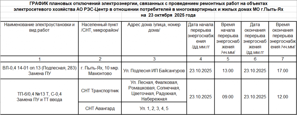 Плановые отключения на 23.10.2024 по городу Пыть-Ях